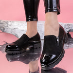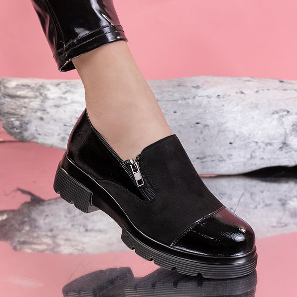 Дамски ежедневни обувки Emera - Black са удобен модел, изработен от еко велур и лачена еко кожа с дебелина на тока - 5 см.
