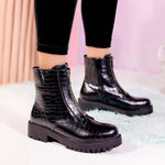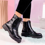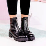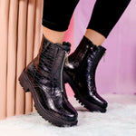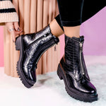Дамски боти Venera - Black са интересен модел с декорация, изработен от лачена еко кожа с топла подплата и дебелина на подметката - 4,5 см.