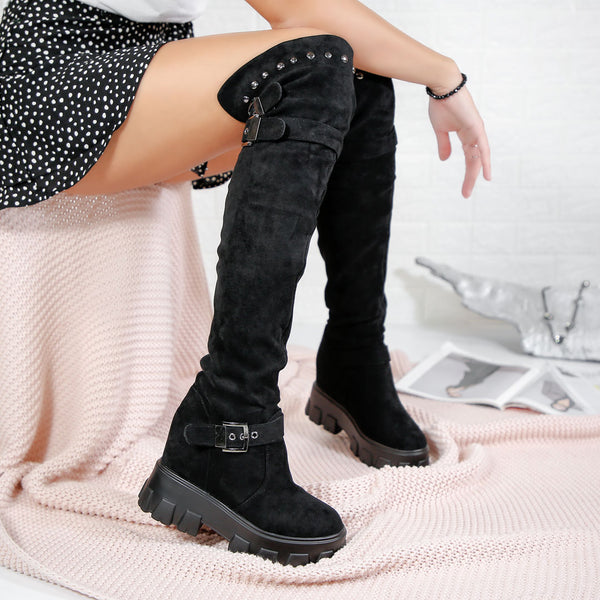 Екстериор - еко велур, интериор - топла подплата, обща дължина на модела - 63 см, подметка - 4 см, платформа - 9 см.