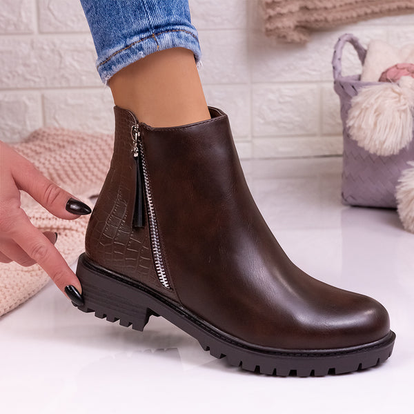 Дамски боти Hilary - Brown са изчистен и много удобен модел с декоративен цип. Изработени са от еко кожа с лека подплата и дебелина на тока - 3,5 см.