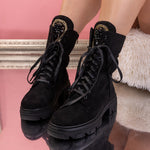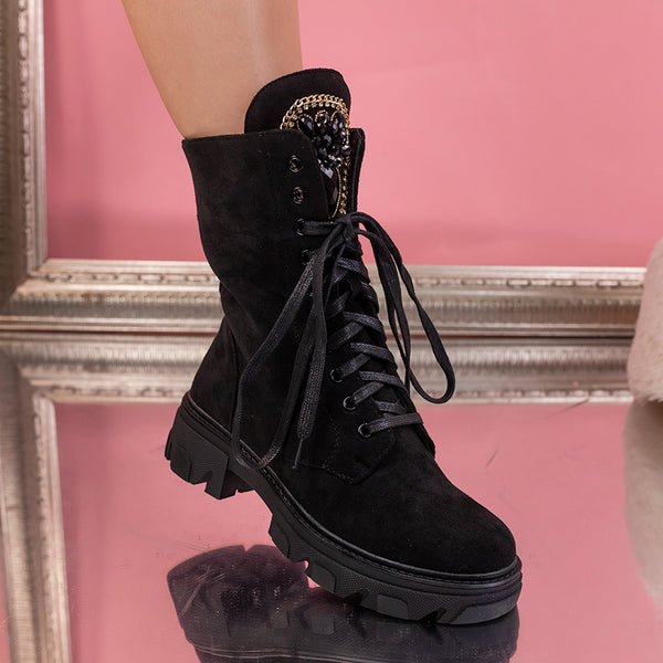 Дамски боти Polina - Black са удобен модел с интересен детайл, изработен от еко велур с лека подплата и дебелина на тока - 4,5 см.