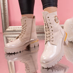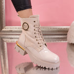 Дамски боти Sevda - Beige са ежедневен модел с декорация, изработен от еко велур и лачена еко кожа с дебелина на тока - 5 см.