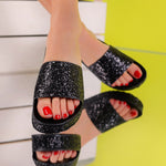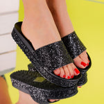 Дамски чехли Soni - Black са интересен модел на дебела подметка, изработен от еко кожа, декорирана с брокат.