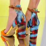 Дамски сандали с ток Ady - Orange са елегантен модел с каишка около глезена. Височината на тока е 9 см. Изработени са от лачена еко кожа и текстил.