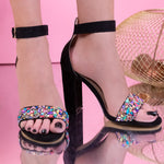 Дамски сандали на ток Balena - Black са елегантен модел, изработен от еко велур и декориран с камъни. Височината на тока е 9,5 см.